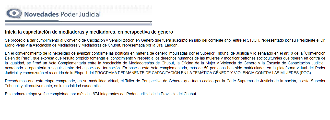 {fa-newspaper-o color=rgb(167,167,167)} El 94% del Poder Judicial de Chubut ya recibió una primera capacitación en perspectiva de género